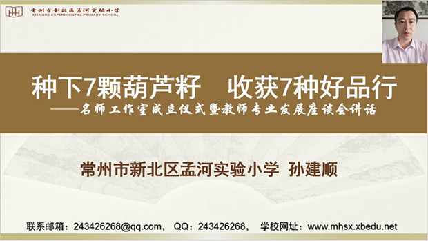 9月22日晚七点,孟河实验小学名师工作室成立仪式暨青年教师专业发展座谈会在腾讯会议室举行,出席会议的有孙建顺副校长、校务管理处王玉珍主任、教师发展处徐黎主任、课程教学处朱琳主任、张炜副主任、各骨干教师以及青年教师。