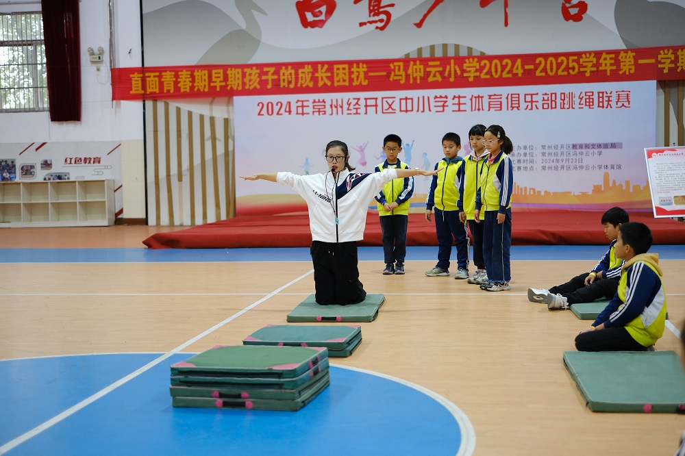 随后,新北区龙城小学徐燕平老师执教了四年级体操大单元第四课时《跪跳起及组合动作展示评价》。徐老师根据新课标要求,加强课程内容整体设计,以发展学生跪跳起能力为核心,以组合学练为基础,注重体操技巧动作技术之间的关联,增强学生对技巧运动项目的完整体验。