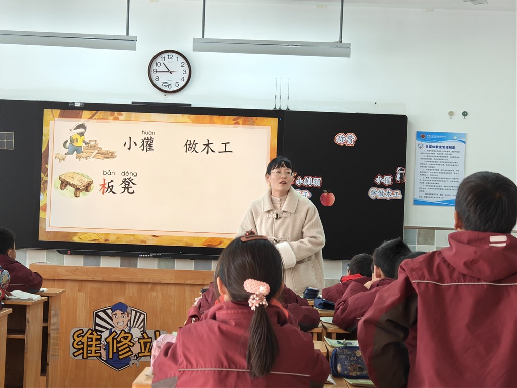 二年级刘艳老师带来充满童趣的《称赞》一课。针对低段学生的认知特点,刘老师以 “情境创设” 为抓手,通过卡通教具、角色扮演等形式,将学生带入课文的童话世界。在识字教学环节,她采用 “偏旁归类”“字理讲解”“游戏巩固” 等多种方法,让学生在趣味互动中扎实掌握 “刺”“猬”“板” 等生字,实现 “识用结合”。课堂中,刘老师注重读写结合,结合课文中 “你真能干,小板凳做得一个比一个好!” 等称赞句式,设计 “夸夸身边的同学”“仿写简单称赞句” 等实践活动,让学生在表达中感悟 “称赞” 的力量,贴近生活的教学设计让低段语文课堂既扎实又生动。