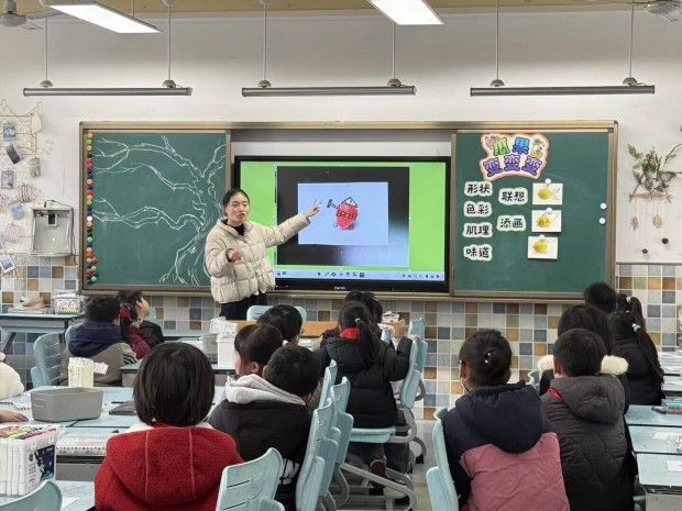 第一节课由孟河实验小学高雨老师执教二年级美术《瓜果变变变》。本节课立足大单元教学理念,以真实的香蕉、柠檬为教学素材,教学设计新颖有趣,高度契合二年级学生的认知特点。课堂伊始,高老师引导学生从不同角度观察瓜果的外形,对比果皮完整与剥皮状态的形态差异,鼓励学生大胆联想、踊跃表达,充分激活了学生的想象力与表达欲。随后,教师聚焦“添画”技巧展开示范教学,提炼总结出瓜果变身的实用小窍门,为学生的创作实践搭建起清晰的方法支架。在课堂小练习环节,学生们紧跟节奏自主创作,将普通瓜果添画成形态各异的创意形象,作品充满童真与巧思。整节课环节衔接自然流畅,从直观感知到技法指导,再到实践创作,层层递进、环环相扣,充分彰显美术学科“玩中学、学中创”的教学特色,高效达成预设教学目标。
